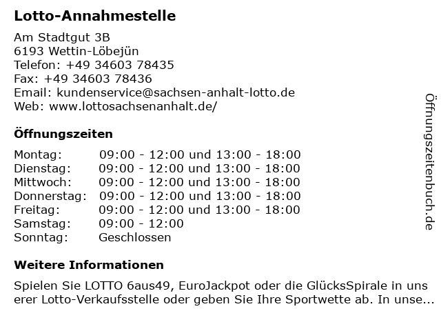 | Öffnungszeiten Lotto-Annahmestelle in Wettin-Löbejün anzeigen | |