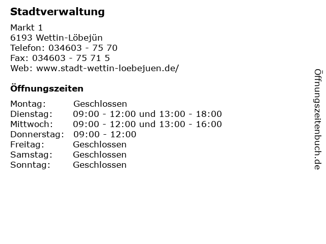 | Öffnungszeiten Stadtverwaltung in Wettin-Löbejün anzeigen | |