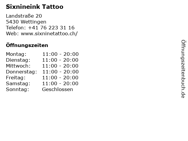 | Öffnungszeiten Sixnineink Tattoo in Wettingen anzeigen | |