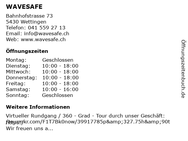 | Öffnungszeiten WAVESAFE in Wettingen anzeigen | |