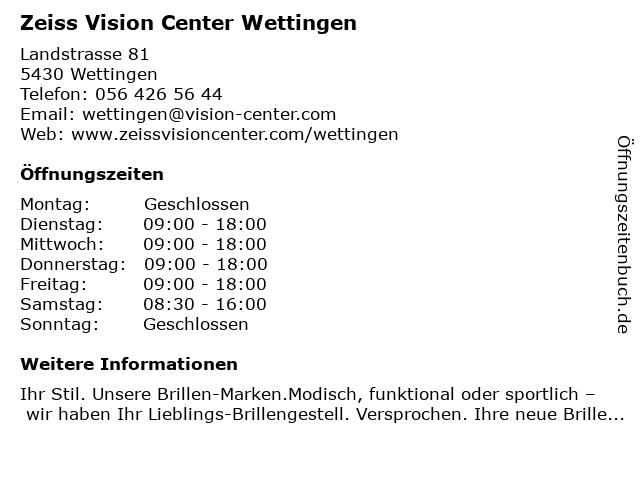 Branchen & Suchbegriffe zu Zeiss Vision Center Wettingen:beratungsstelle, center, gerätereparaturdienst, handwerker, optometrie, vision, wettingen, zeiss |