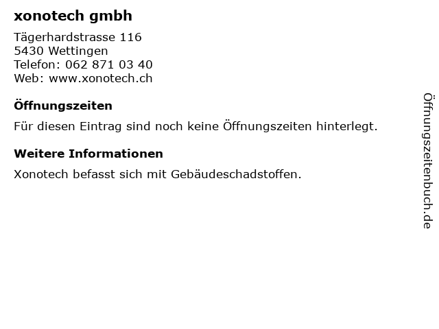 | Öffnungszeiten xonotech gmbh in Wettingen anzeigen | |