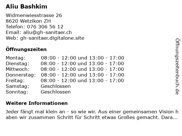 | Öffnungszeiten Aliu Bashkim in Wetzikon ZH anzeigen | |