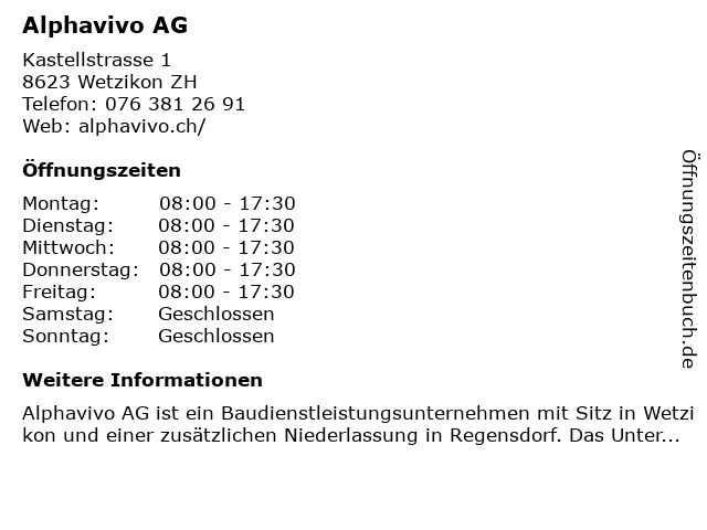 | Öffnungszeiten Alphavivo AG in Wetzikon ZH anzeigen | |