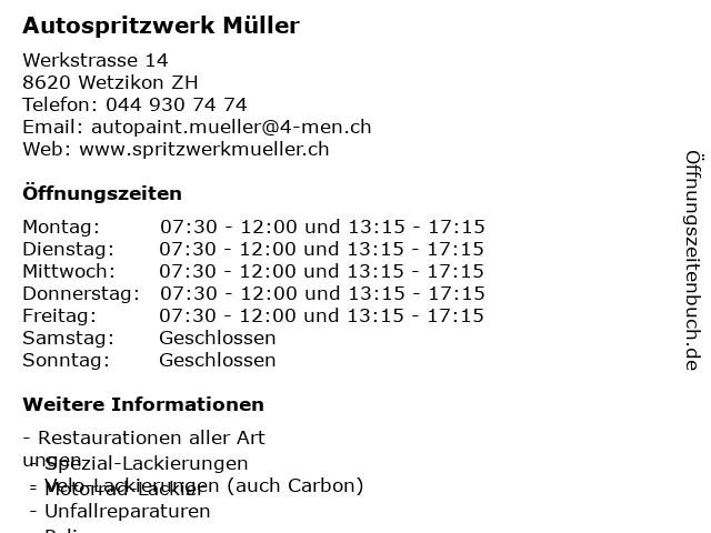 | Öffnungszeiten Autospritzwerk Müller in Wetzikon ZH anzeigen | |