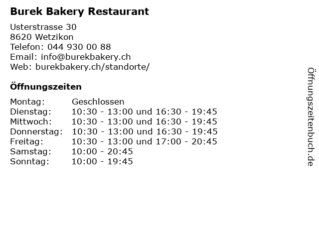 | Öffnungszeiten Burek Bakery Restaurant in Wetzikon anzeigen | |