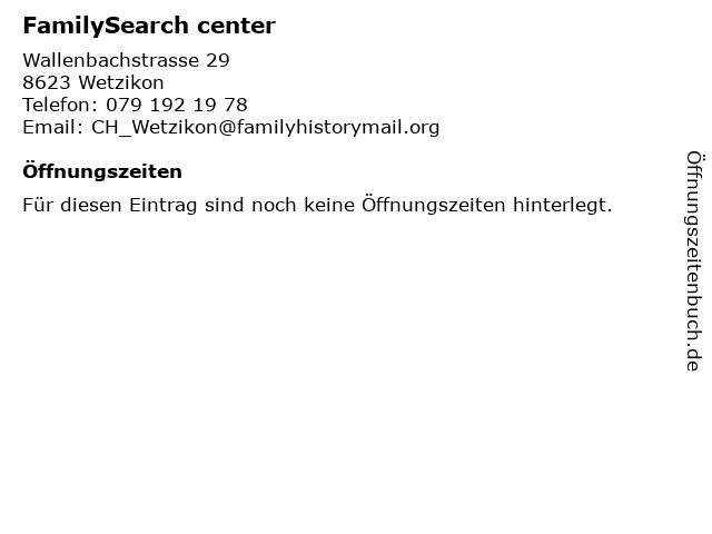 | Öffnungszeiten FamilySearch center in Wetzikon anzeigen | |