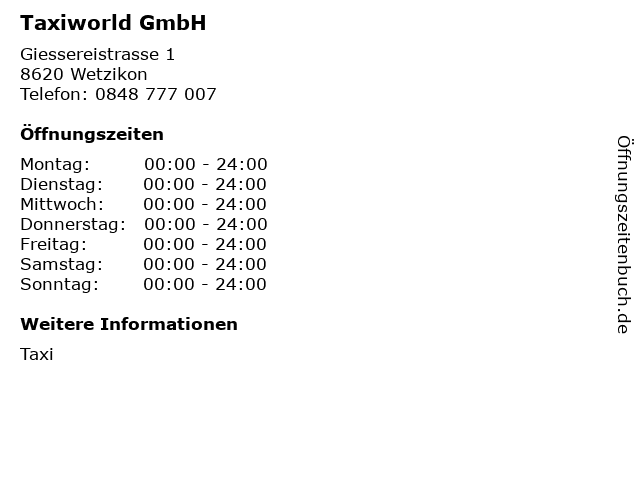 | Öffnungszeiten Taxiworld GmbH in Wetzikon anzeigen | |