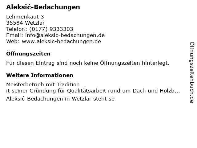 | Öffnungszeiten Aleksić-Bedachungen in Wetzlar anzeigen | |