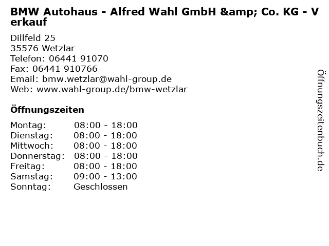1 BMW Autohaus - Alfred Wahl GmbH & Co. KG - Teile und Zubehör (Entfernung: 0,00 km) Dillfeld 25, 35576 Wetzlar 6 |