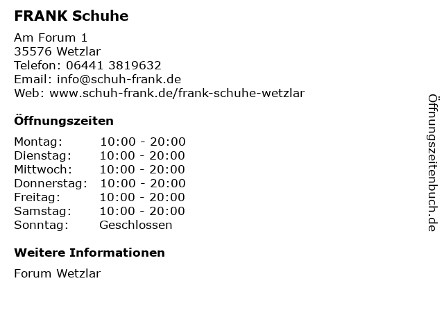 | Öffnungszeiten FRANK Schuhe in Wetzlar anzeigen | |