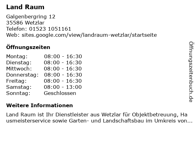 | Öffnungszeiten Land Raum in Wetzlar anzeigen | |