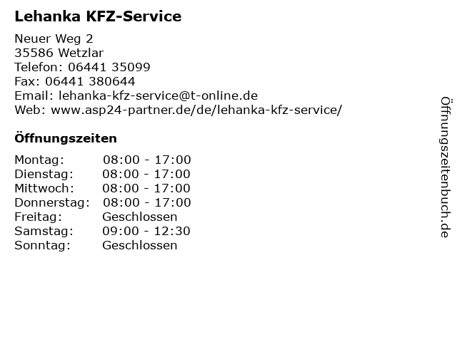 | Öffnungszeiten Lehanka KFZ-Service in Wetzlar anzeigen | |
