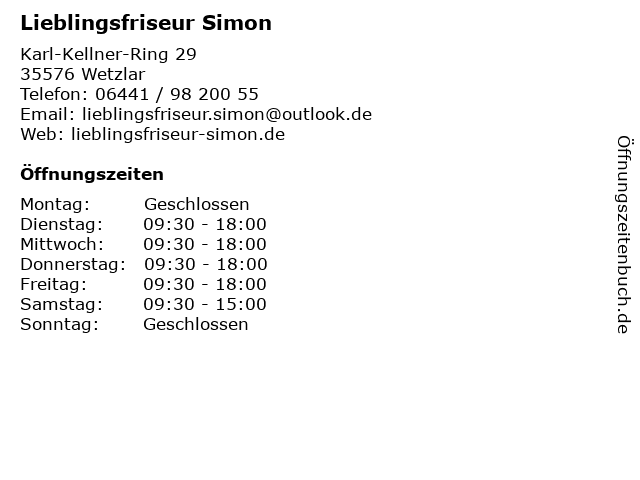 | Öffnungszeiten Lieblingsfriseur Simon in Wetzlar anzeigen | |