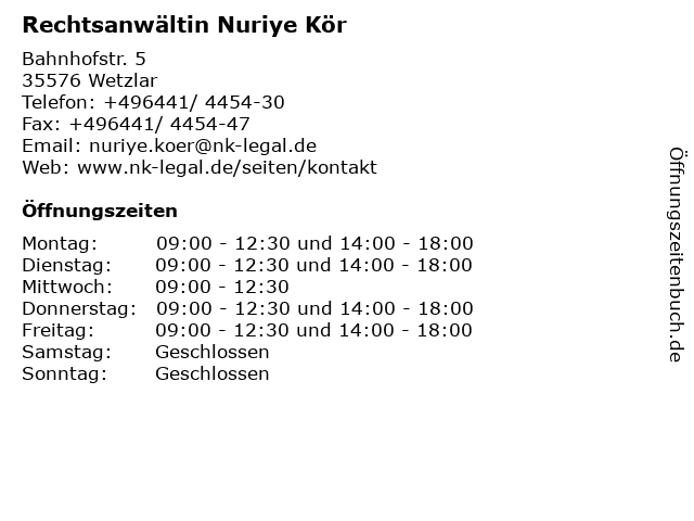 | Öffnungszeiten Rechtsanwältin Nuriye Kör in Wetzlar anzeigen | |