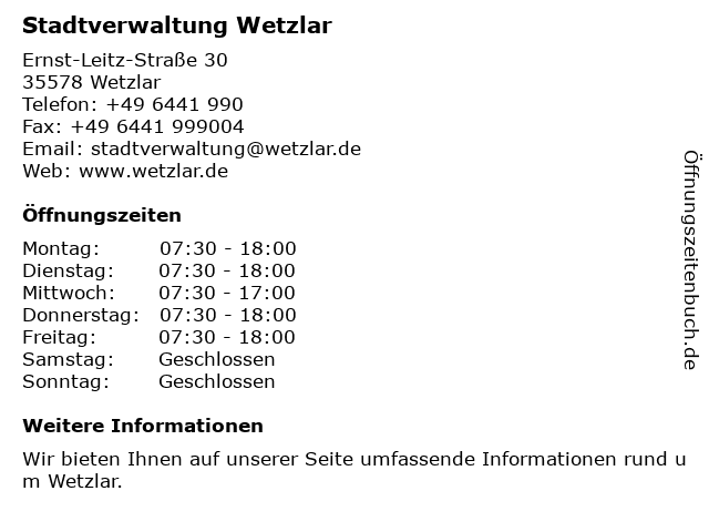 | Öffnungszeiten Stadtverwaltung Wetzlar in Wetzlar anzeigen | |