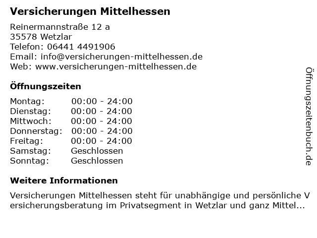 | Öffnungszeiten Versicherungen Mittelhessen in Wetzlar anzeigen | |