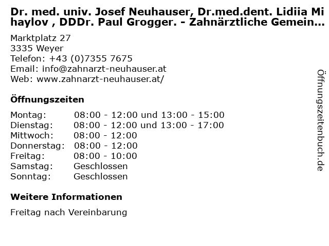 Branchen & Suchbegriffe zu Dr. med. univ. Josef Neuhauser, Dr.med.dent. Lidiia Mihaylov , DDDr. Paul Grogger. - Zahnärztliche Gemeinschaftspraxis:dddr., dr., dr.med.dent., gemeinschaftspraxis, grogger., josef, kieferheilkunde, kieferorthopäde, lidiia, med., mihaylov, mund, neuhauser, paul, univ., zahn, zahnarzt, zahnarztpraxis, zahnersatz, zahnheilkunde, zahnärztliche |