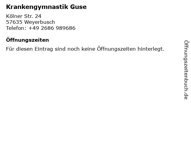 | Öffnungszeiten Krankengymnastik Guse in Weyerbusch anzeigen | |