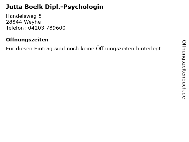 | Öffnungszeiten Jutta Boelk Dipl.-Psychologin in Weyhe anzeigen | |
