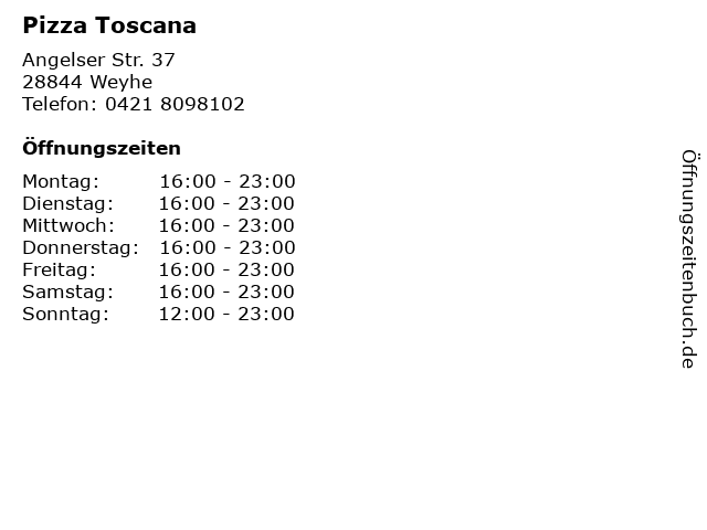| Öffnungszeiten Pizza Toscana in Weyhe anzeigen | |