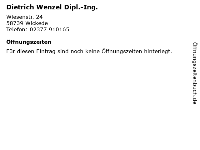 | Öffnungszeiten Dietrich Wenzel Dipl.-Ing. in Wickede anzeigen | |
