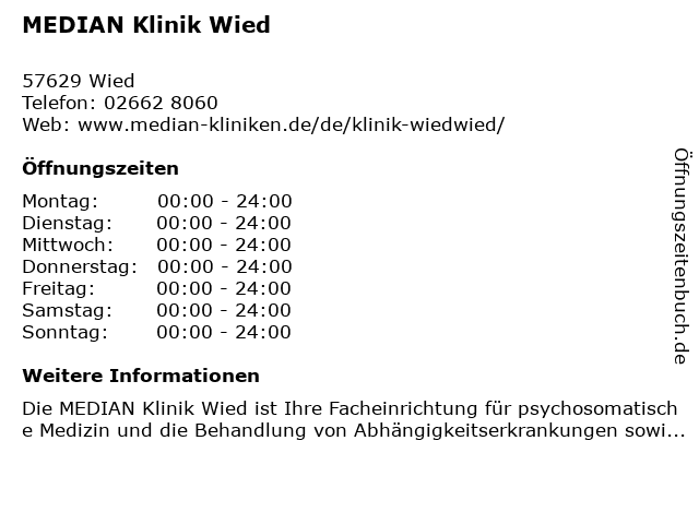 | Öffnungszeiten MEDIAN Klinik Wied in Wied anzeigen | |