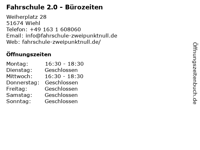 | Öffnungszeiten Fahrschule 2.0 - Bürozeiten in Wiehl anzeigen | |