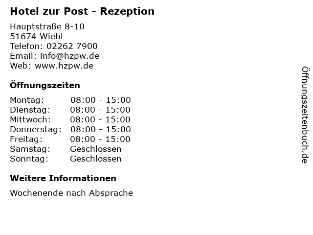 | Öffnungszeiten Hotel zur Post - Rezeption in Wiehl anzeigen | |