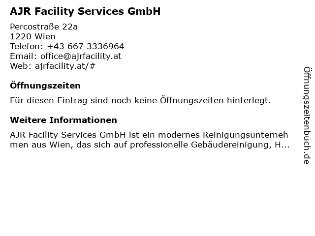 | Öffnungszeiten AJR Facility Services GmbH in Wien anzeigen | |