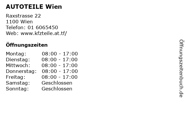 | Öffnungszeiten AUTOTEILE Wien in Wien anzeigen | |