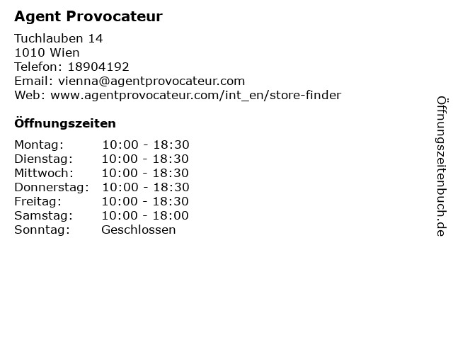 | Öffnungszeiten Agent Provocateur in Wien anzeigen | |