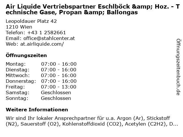 1 Eschlböck & Hoznor GesmbH & Co KG - Stahlcenter (Entfernung: 1,48 km) Leopoldauer Platz 42, 1210 Wien 6 Austro Control GmbH Unternehmenszentrale & Air Traffic Control Center Vienna (Entfernung: 7,60 km) Schnirchgasse 17, 1030 Wien |