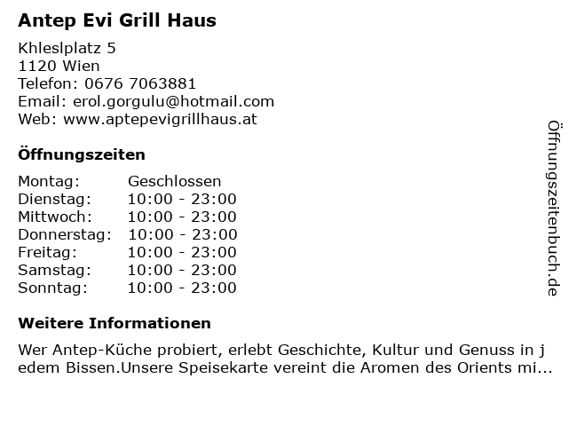 | Öffnungszeiten Antep Evi Grill Haus in Wien anzeigen | |