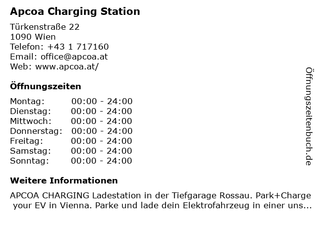 | Öffnungszeiten Apcoa Charging Station in Wien anzeigen | |