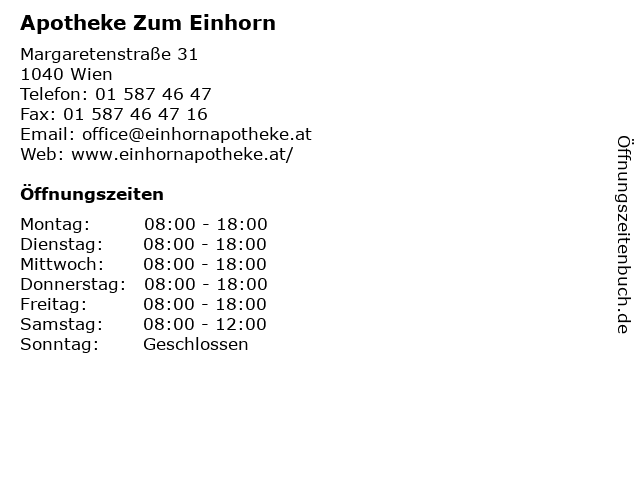 | Öffnungszeiten Apotheke Zum Einhorn in Wien anzeigen | |