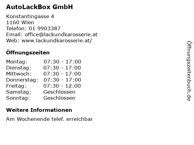 | Öffnungszeiten AutoLackBox GmbH in Wien anzeigen | |