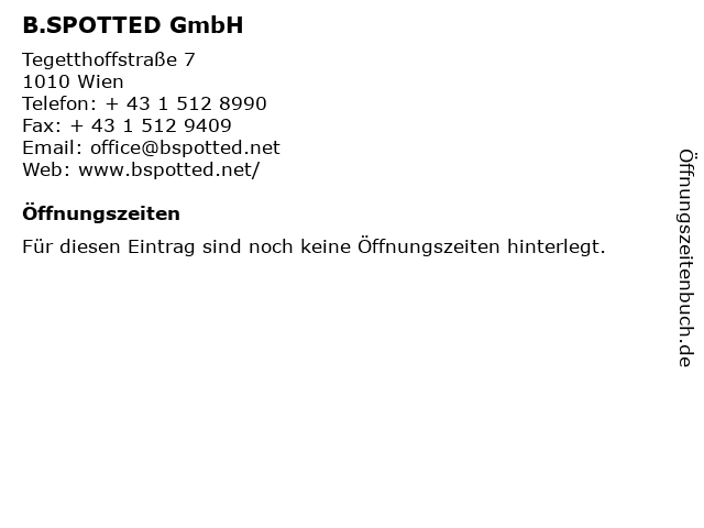 | Öffnungszeiten B.SPOTTED GmbH in Wien anzeigen | |