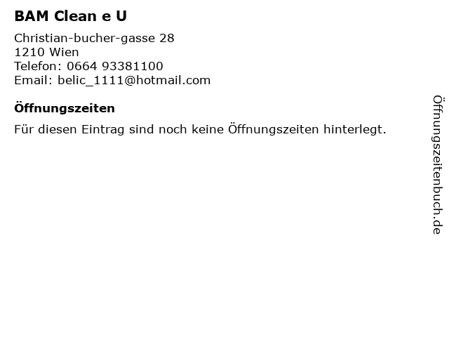 | Öffnungszeiten BAM Clean e U in Wien anzeigen | |