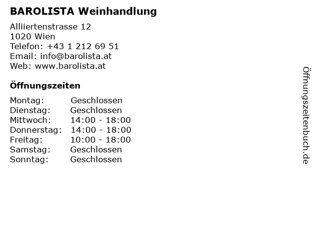 | Öffnungszeiten BAROLISTA Weinhandlung in Wien anzeigen | |