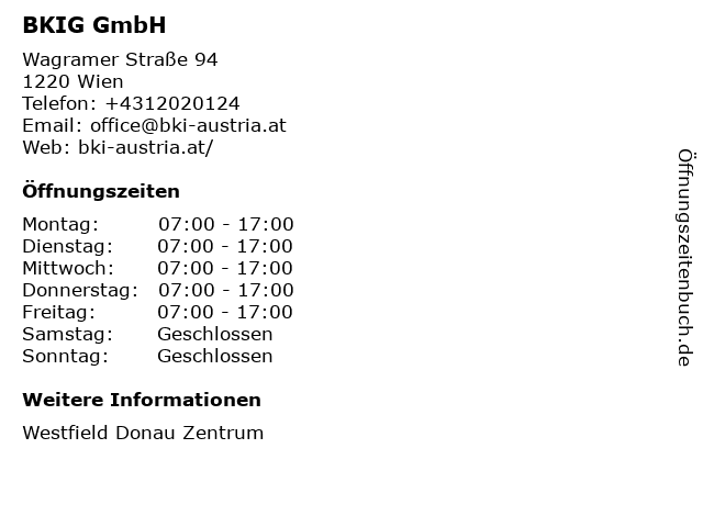 | Öffnungszeiten BKIG GmbH in Wien anzeigen | |