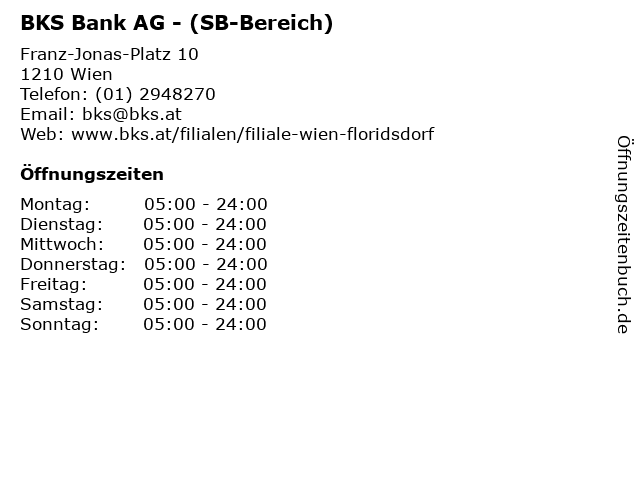 | Öffnungszeiten BKS Bank AG - (SB-Bereich) in Wien anzeigen | |
