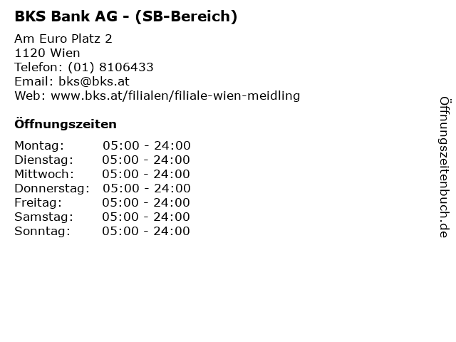 | Öffnungszeiten BKS Bank AG - (SB-Bereich) in Wien anzeigen | |