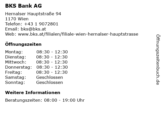 | Öffnungszeiten BKS Bank AG in Wien anzeigen | |