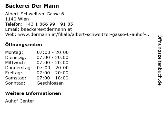 | Öffnungszeiten Bäckerei Der Mann in Wien anzeigen | |