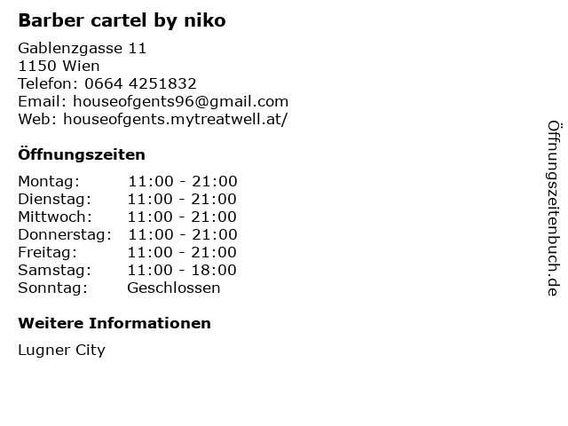 | Öffnungszeiten Barber cartel by niko in Wien anzeigen | |