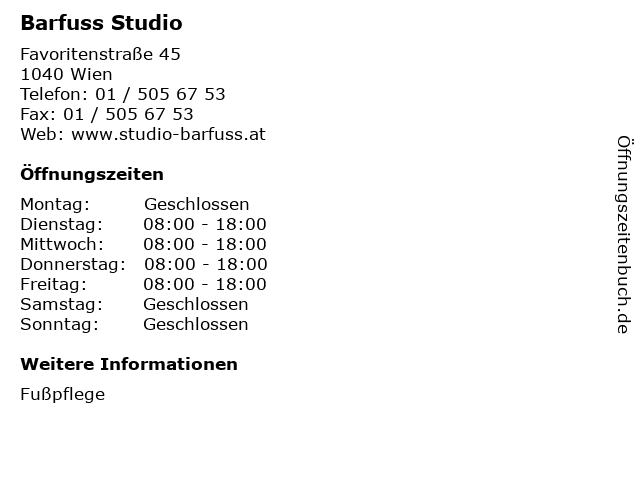 | Öffnungszeiten Barfuss Studio in Wien anzeigen | |