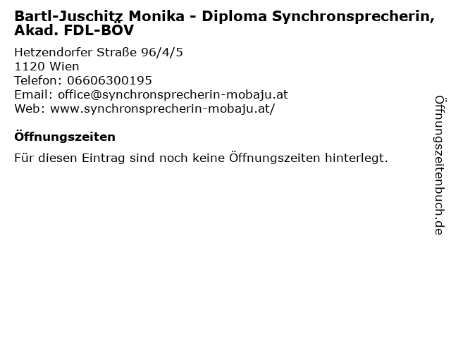 | Bartl-Juschitz Monika - Diploma Synchronsprecherin, Akad. FDL-BÖV anrufen | |