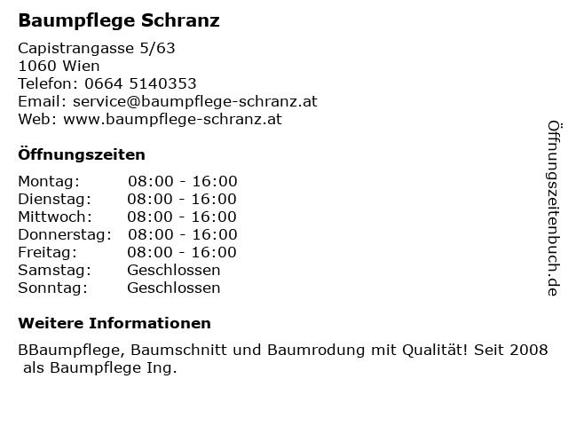 | Öffnungszeiten Baumpflege Schranz in Wien anzeigen | |