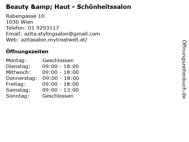 | Öffnungszeiten Beauty & Haut - Schönheitssalon in Wien anzeigen | |